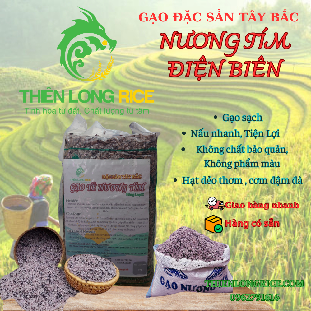 GẠO TẺ NƯƠNG TÍM: xuất thân từ vùng Tây Bắc và được trồng ở nương cao, mỗi năm chỉ có 1-2 vụ thôi nên rất hiếm. Gạo tẻ Nương tím cho cơm chất lượng mềm dẻo, ngọt cơm và thoang thoảng thơm tự nhiên. Gạo được đồng bào H'mông trồng trên núi cao và hoàn toàn không dùng thuốc trừ sâu lẫn phân hóa học. Ngay quá trình thu hoạch và xay sát cũng hoàn toàn thủ công vì trên nương cao, họ hoàn toàn thiếu những phương tiện ấy !Gạo tẻ H'Mông có vị dẻo đậm đà đặc trưng khác hẳn với những loại gạo tẻ được trồng trên những vùng đất khác. Gạo thơm ngon không bị ngấy và dễ ăn.Gạo tẻ tím hỗ trợ cực tốt cho những người đang trong chế độ ăn đặc biệt ạ (những người tiểu đường hay giảm cân ...) đều cực kì tốt nha- Không những thế những người ăn chay cũng rất phù hợp vì gạo rất nhiều chất dinh dưỡng, ăn cơm muối vừng hay chan xì dầu đã ngon lắm rồi ạ- Hạt gạo căng, mẩy, nửa trắng nửa lớp tím, nấu lên sẽ có màu tím nhạt. Đặc biệt là KHÔNG CẦN NGÂM MÀ NẤU TRỰC TIẾP được luôn. Gạo ăn có vị ngọt, càng nhai càng ngọt , dẻo cực kì, ko hề bị nát và nấu ít nước, mỗi bữa chỉ cần ăn 1/2 - 1 chén cơm là no mà vẫn đủ chất.Tiêu chuẩn kỹ thuật:- Tiêu chuẩn xuất khẩu, nguyên chất 100%, không pha trộn.- Tỉ lệ tấm: 5%- Độ ẩm: < 15%Giá trị dinh dưỡng:Giá trị dinh dưỡng 100 g (3,5 oz) Năng lượng 1.527 kJ (365 kcal) Các bon hyđrát 79 g Đường 0.12 g Chất xơ thực phẩm 1.3 g Chất béo 0.66 g Protein 7.13 g Nước 11.62 g Thiamine (Vit. B1) 0.070 mg (5%) Riboflavin (Vit. B2) 0.049 mg (3%) Niacin (Vit. B3) 1.6 mg (11%) Axít pantothenic (B5) 1.014 mg (20%) Vitamin B6 0.164 mg (13%) Axít folic (Vit. B9) 8 μg (2%) Can xi 28 mg (3%) Sắt 0.80 mg (6%) Ma giê 25 mg (7%) Mang gan 1.088 mg (54%) Phốt pho 115 mg (16%) Ka li 115 mg (2%) Thiếc 1.09 mg (11%) Tỷ lệ phần trăm theo lượng hấp thụ thường nhật của người lớn.- Đóng gói: túi 1kgCách nấu:- Đong gạo theo nhu cầu- Vo gạo vài lần bằng nước sạch- Chế nước theo tỉ lệ: 1 kg gạo / 1,1 lít nước- Không mở nắp nồi trong lúc nấu cho đến sau khi cơm sôi được 15 phútBảo quản nơi khô ráo thoáng máthiên Long Rice với phương châm hoạt động “Tinh Hoa Từ Đất - Chất Lượng Từ Tâm” giúp khách hàng những điều tốt nhất.Thiên Long Rice GỌI CÓ NGAY .Giao hàng tận nơi 30 - 60 phút nội thành TPHCM.0962791616 - 0967815915 - 0983505254Kho - VP: 152/39 Nguyễn Văn Thương phường 25 bình thạnh ( chợ văn thánh )p Nhà Máy; Cụm Công Nghiệp An Thạnh, Đông Hòa Hiệp, Cái Bè, Tiền Giang